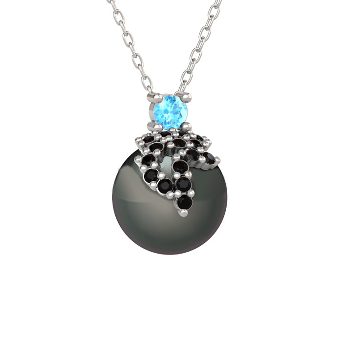 Akuamarin, siyah zirkon ve siyah inci 14 ayar beyaz altın kolye (40 cm gümüş rolo zincir)