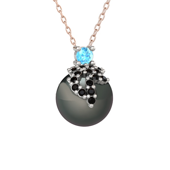 Akuamarin, siyah zirkon ve siyah inci 14 ayar beyaz altın kolye (40 cm rose altın rolo zincir)