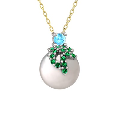 Akuamarin, yeşil kuvars ve inci 8 ayar beyaz altın kolye (40 cm gümüş rolo zincir)