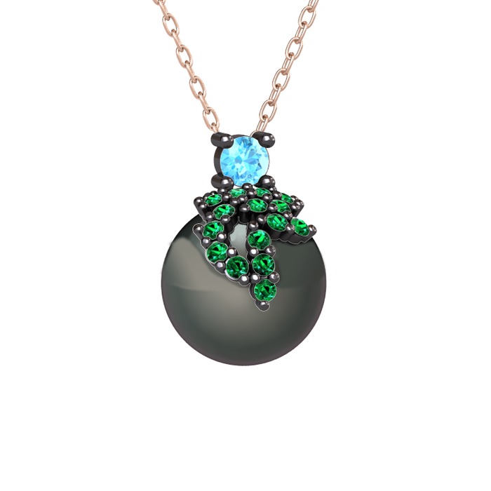 Akuamarin, yeşil kuvars ve siyah inci 925 ayar siyah rodyum kaplama gümüş kolye (40 cm rose altın rolo zincir)