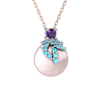 Ametist, akuamarin ve pembe inci 8 ayar beyaz altın kolye (40 cm rose altın rolo zincir)