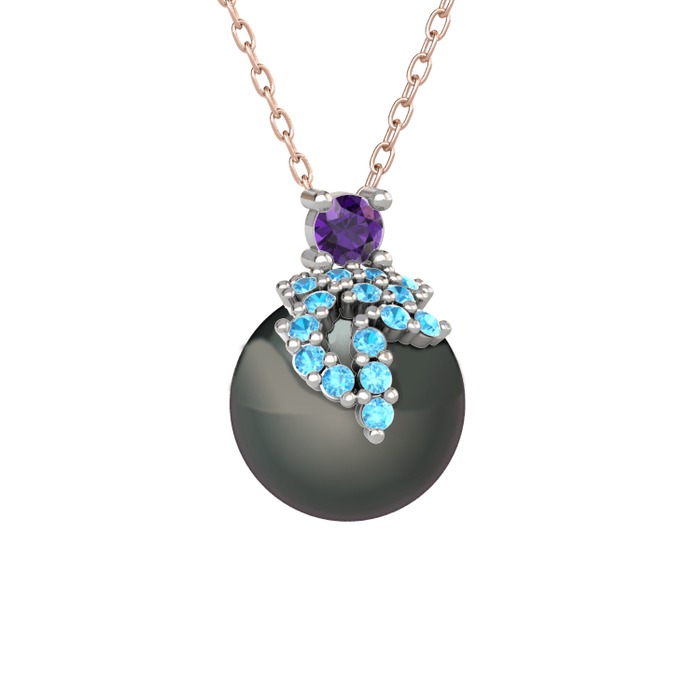 Ametist, akuamarin ve siyah inci 8 ayar beyaz altın kolye (40 cm gümüş rolo zincir)