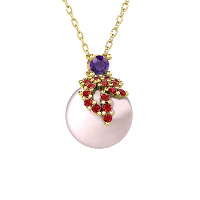 Ametist, garnet ve pembe inci 18 ayar altın kolye (40 cm gümüş rolo zincir)
