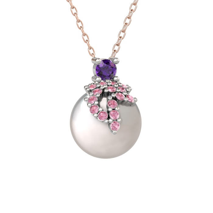 Ametist, pembe kuvars ve inci 14 ayar beyaz altın kolye (40 cm rose altın rolo zincir)