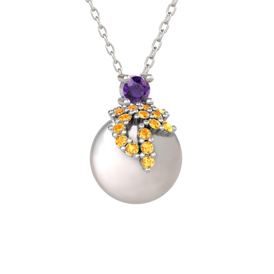Ametist, sitrin ve inci 925 ayar gümüş kolye (40 cm beyaz altın rolo zincir)