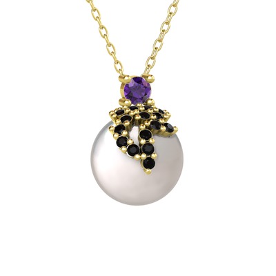 Ametist, siyah zirkon ve inci 8 ayar altın kolye (40 cm altın rolo zincir)