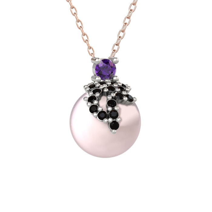 Ametist, siyah zirkon ve pembe inci 14 ayar beyaz altın kolye (40 cm rose altın rolo zincir)