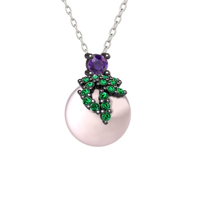 Ametist, yeşil kuvars ve pembe inci 925 ayar siyah rodyum kaplama gümüş kolye (40 cm beyaz altın rolo zincir)