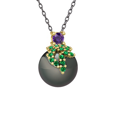 Ametist, yeşil kuvars ve siyah inci 8 ayar altın kolye (40 cm gümüş rolo zincir)