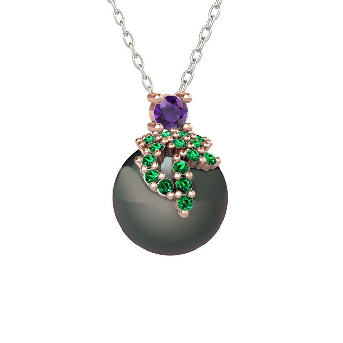 Ametist, yeşil kuvars ve siyah inci 8 ayar rose altın kolye (40 cm gümüş rolo zincir)