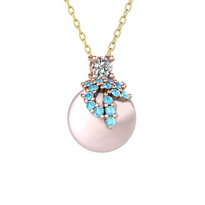 Beyaz zirkon, akuamarin ve pembe inci 8 ayar rose altın kolye (40 cm gümüş rolo zincir)