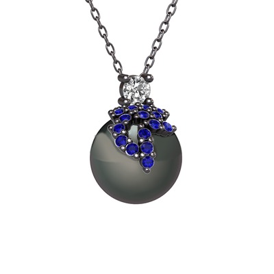 Beyaz zirkon, lab safir ve siyah inci 925 ayar siyah rodyum kaplama gümüş kolye (40 cm gümüş rolo zincir)