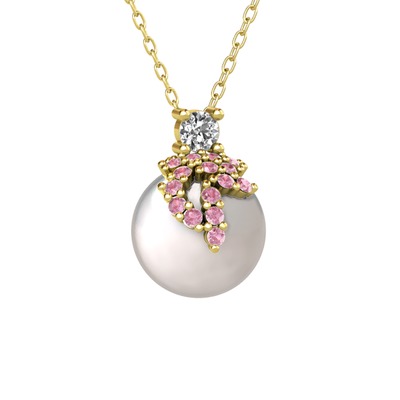 Beyaz zirkon, pembe kuvars ve inci 14 ayar altın kolye (40 cm gümüş rolo zincir)