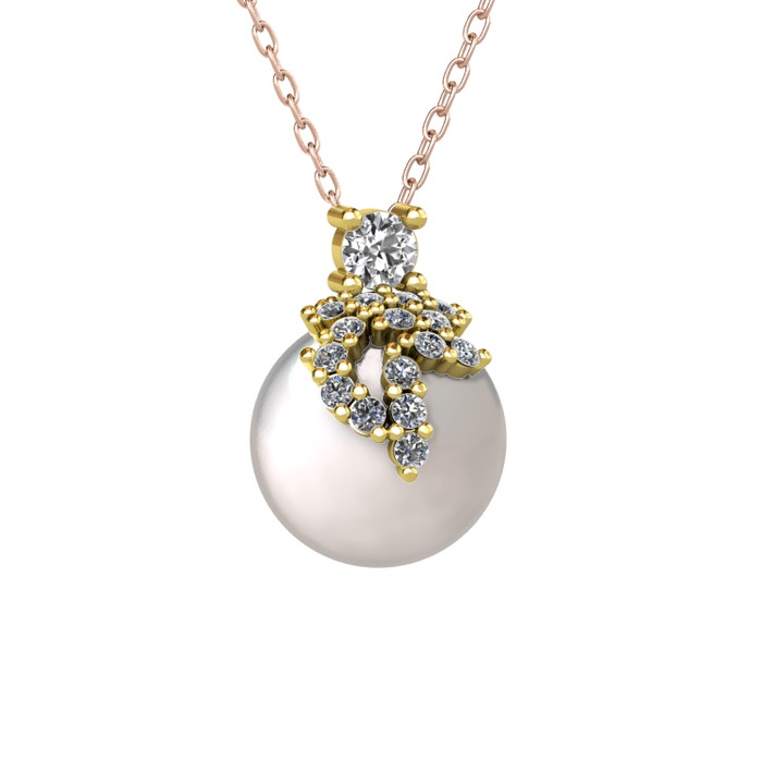 Beyaz zirkon, pırlanta ve inci 14 ayar altın kolye (0.176 karat, 40 cm gümüş rolo zincir)