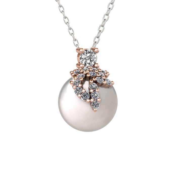 Beyaz zirkon, pırlanta ve inci 925 ayar rose altın kaplama gümüş kolye (0.176 karat, 40 cm gümüş rolo zincir)