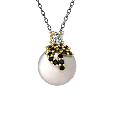 Beyaz zirkon, siyah zirkon ve inci 14 ayar altın kolye (40 cm gümüş rolo zincir)