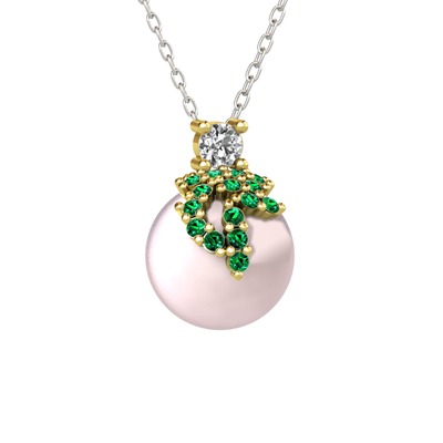 Beyaz zirkon, yeşil kuvars ve pembe inci 18 ayar altın kolye (40 cm beyaz altın rolo zincir)