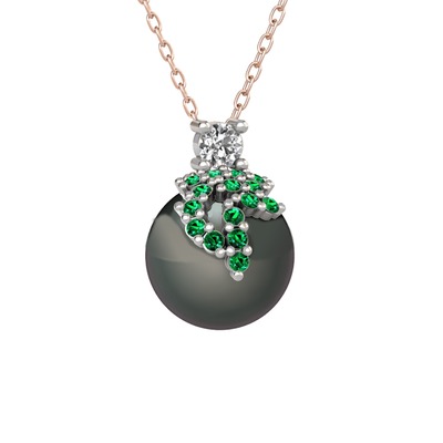 Beyaz zirkon, yeşil kuvars ve siyah inci 14 ayar beyaz altın kolye (40 cm rose altın rolo zincir)