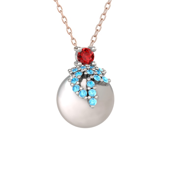 Garnet, akuamarin ve inci 18 ayar beyaz altın kolye (40 cm rose altın rolo zincir)