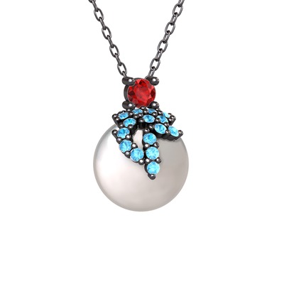 Garnet, akuamarin ve inci 925 ayar siyah rodyum kaplama gümüş kolye (40 cm gümüş rolo zincir)