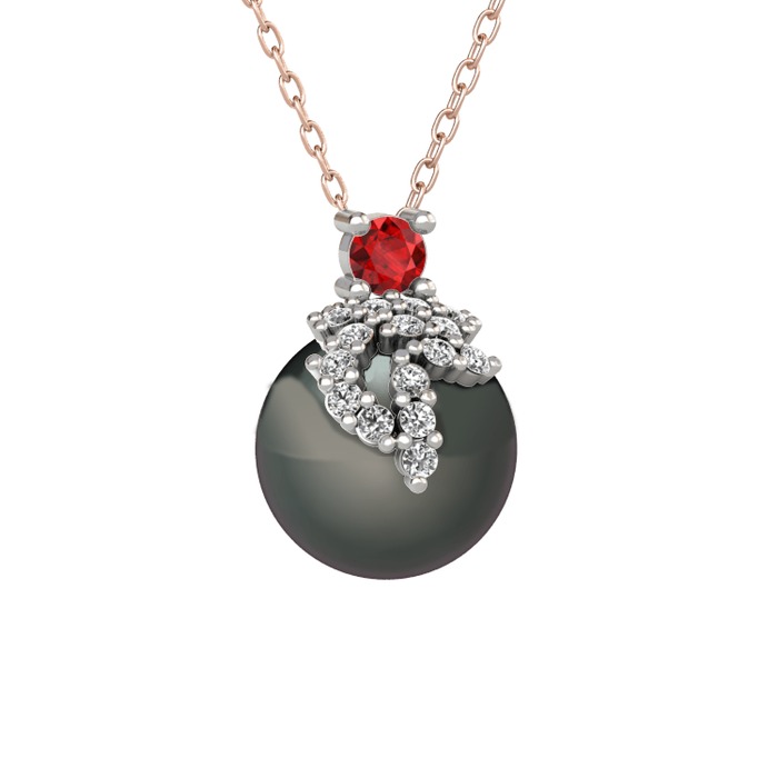 Garnet, beyaz zirkon ve siyah inci 8 ayar beyaz altın kolye (40 cm rose altın rolo zincir)
