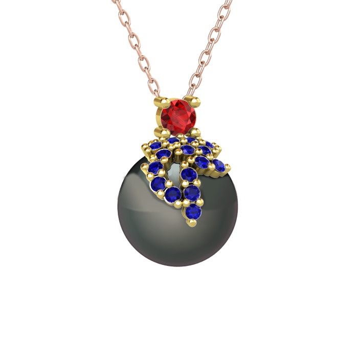 Garnet, lab safir ve siyah inci 14 ayar altın kolye (40 cm gümüş rolo zincir)