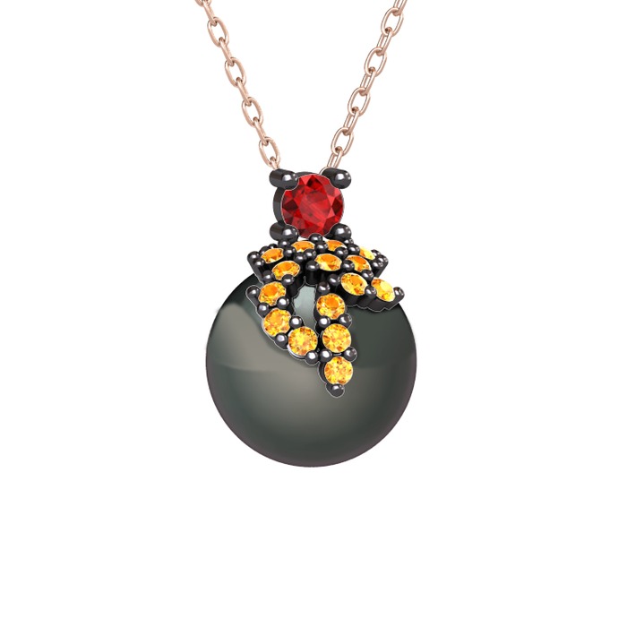 Garnet, sitrin ve siyah inci 925 ayar siyah rodyum kaplama gümüş kolye (40 cm rose altın rolo zincir)