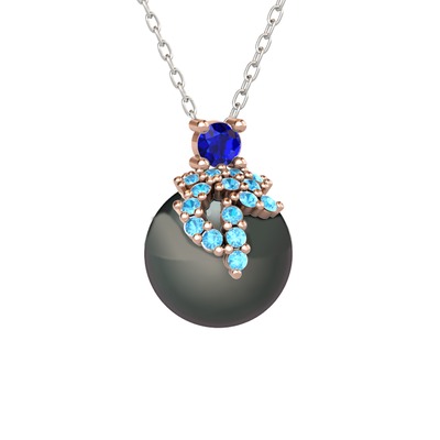 Lab safir, akuamarin ve siyah inci 18 ayar rose altın kolye (40 cm beyaz altın rolo zincir)