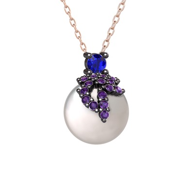 Lab safir, ametist ve inci 925 ayar siyah rodyum kaplama gümüş kolye (40 cm gümüş rolo zincir)