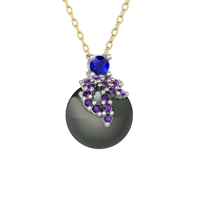 Lab safir, ametist ve siyah inci 14 ayar beyaz altın kolye (40 cm altın rolo zincir)