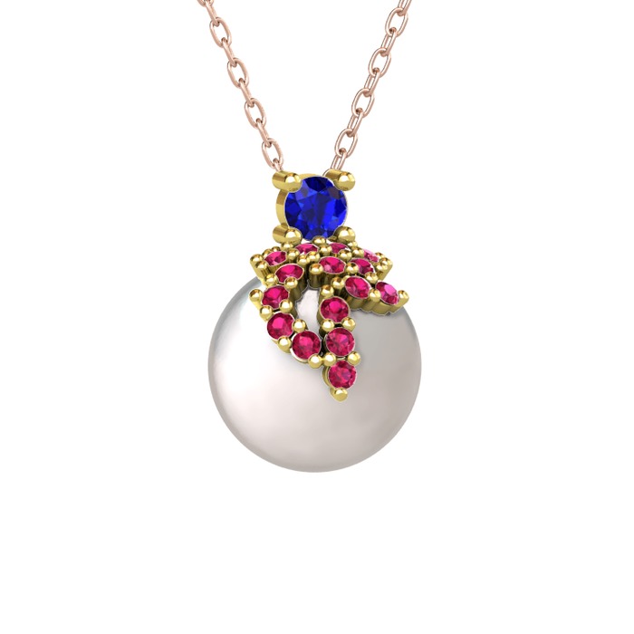Lab safir, rodolit garnet ve inci 14 ayar altın kolye (40 cm gümüş rolo zincir)