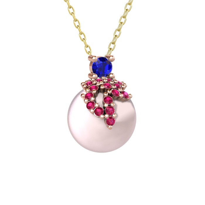Lab safir, rodolit garnet ve pembe inci 925 ayar rose altın kaplama gümüş kolye (40 cm altın rolo zincir)