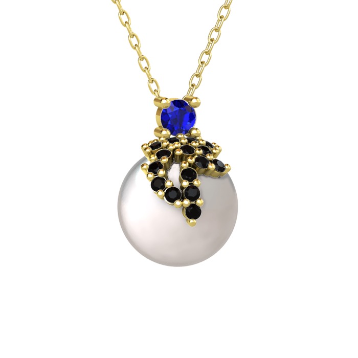 Lab safir, siyah zirkon ve inci 8 ayar altın kolye (40 cm altın rolo zincir)
