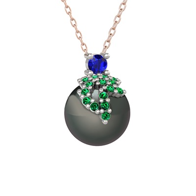 Lab safir, yeşil kuvars ve siyah inci 8 ayar beyaz altın kolye (40 cm rose altın rolo zincir)