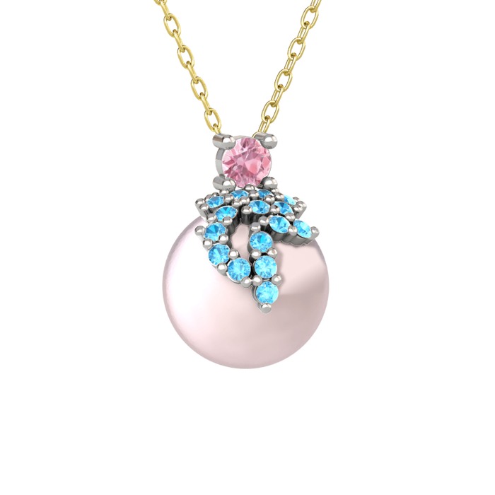 Pembe kuvars, akuamarin ve pembe inci 8 ayar beyaz altın kolye (40 cm altın rolo zincir)