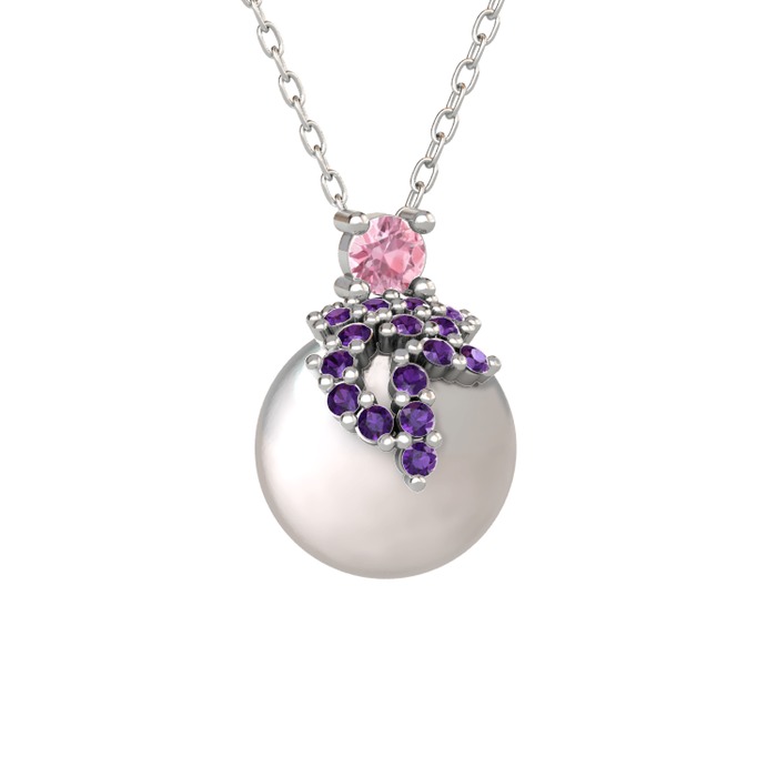 Pembe kuvars, ametist ve inci 18 ayar beyaz altın kolye (40 cm beyaz altın rolo zincir)