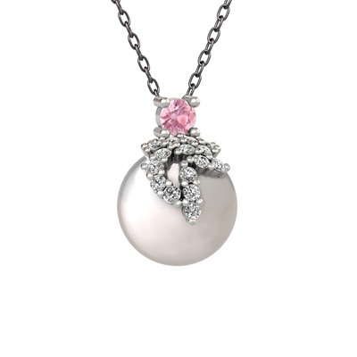 Pembe kuvars, beyaz zirkon ve inci 14 ayar beyaz altın kolye (40 cm gümüş rolo zincir)