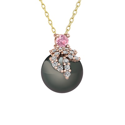 Pembe kuvars, beyaz zirkon ve siyah inci 925 ayar rose altın kaplama gümüş kolye (40 cm altın rolo zincir)