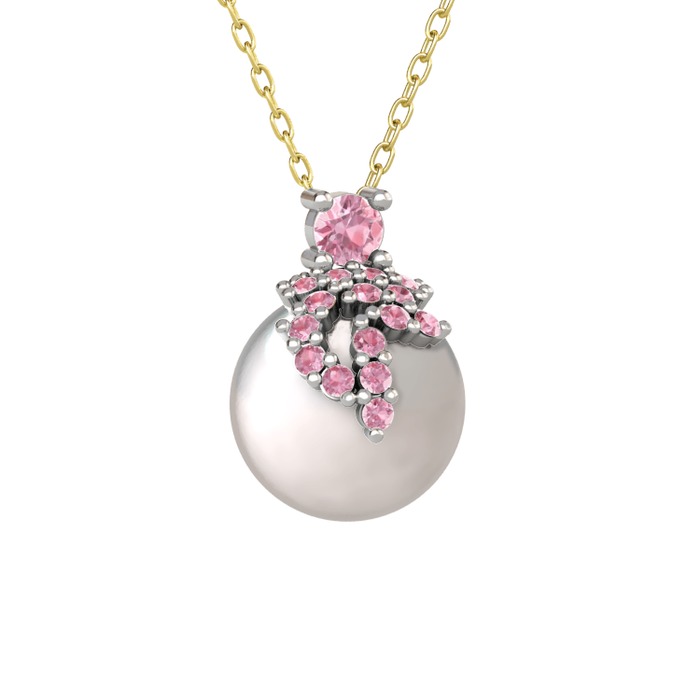 Pembe kuvars ve inci 8 ayar beyaz altın kolye (40 cm gümüş rolo zincir)