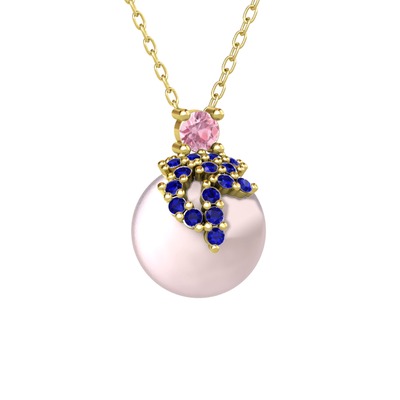 Pembe kuvars, lab safir ve pembe inci 14 ayar altın kolye (40 cm gümüş rolo zincir)