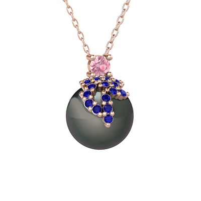 Pembe kuvars, lab safir ve siyah inci 8 ayar rose altın kolye (40 cm rose altın rolo zincir)