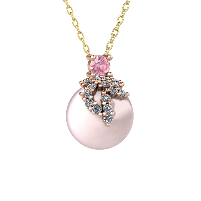 Pembe kuvars, pırlanta ve pembe inci 14 ayar rose altın kolye (0.176 karat, 40 cm altın rolo zincir)