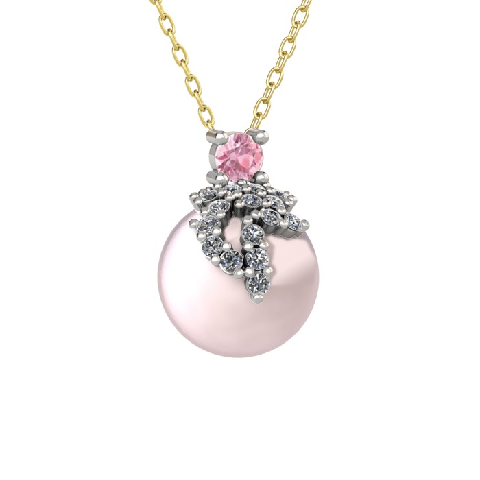 Pembe kuvars, pırlanta ve pembe inci 8 ayar beyaz altın kolye (0.176 karat, 40 cm gümüş rolo zincir)