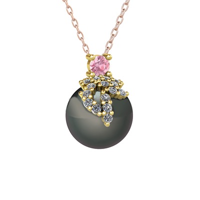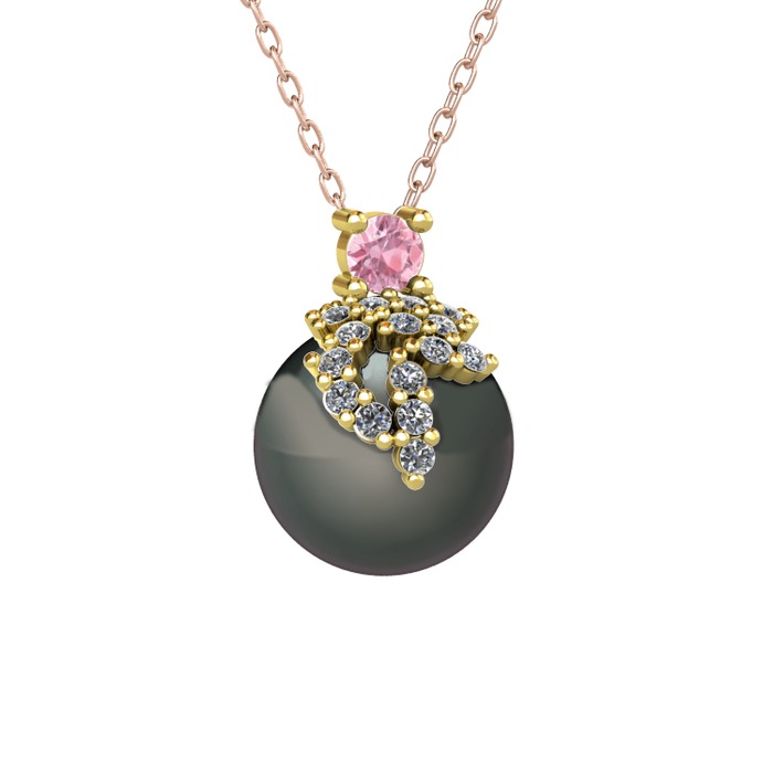 Pembe kuvars, pırlanta ve siyah inci 18 ayar altın kolye (0.176 karat, 40 cm rose altın rolo zincir)