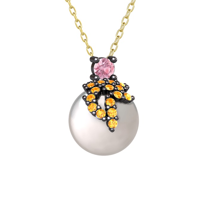 Pembe kuvars, sitrin ve inci 925 ayar siyah rodyum kaplama gümüş kolye (40 cm gümüş rolo zincir)