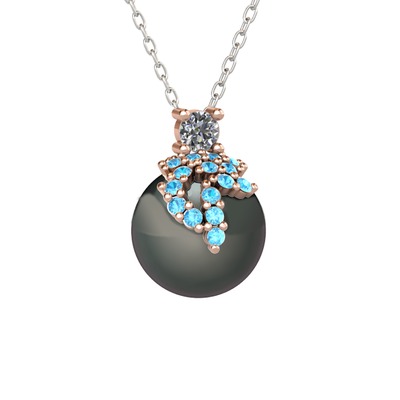 Pırlanta, akuamarin ve siyah inci 14 ayar rose altın kolye (0.11 karat, 40 cm gümüş rolo zincir)