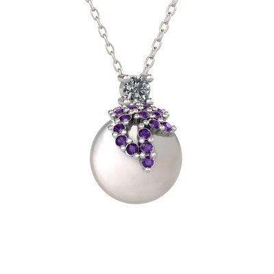 Pırlanta, ametist ve inci 8 ayar beyaz altın kolye (0.11 karat, 40 cm beyaz altın rolo zincir)