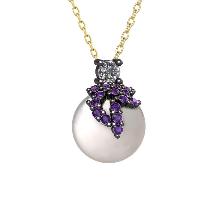 Pırlanta, ametist ve inci 925 ayar siyah rodyum kaplama gümüş kolye (0.11 karat, 40 cm altın rolo zincir)