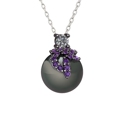 Pırlanta, ametist ve siyah inci 925 ayar siyah rodyum kaplama gümüş kolye (0.11 karat, 40 cm beyaz altın rolo zincir)