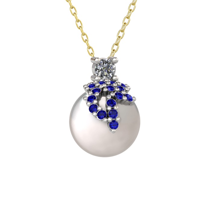 Pırlanta, lab safir ve inci 18 ayar beyaz altın kolye (0.11 karat, 40 cm altın rolo zincir)